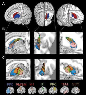 Figure 1: (A) Three-dimensional segmentation of the human caudate (red) and putamen (blue). Organisation of cortical connections within the (B) caudate and (C) putamen. The cortical target regions of interest corresponding to each colour in (B & C) are shown at bottom. All segmentations are overlaid on the standard space MNI152 T1 weighted 1mm structural MR image. PF, Prefrontal; PM, Premotor; M1, Primary motor; S1; Somatosensory; PP, Posterior parietal; OCC, Occipital; TEM, Temporal